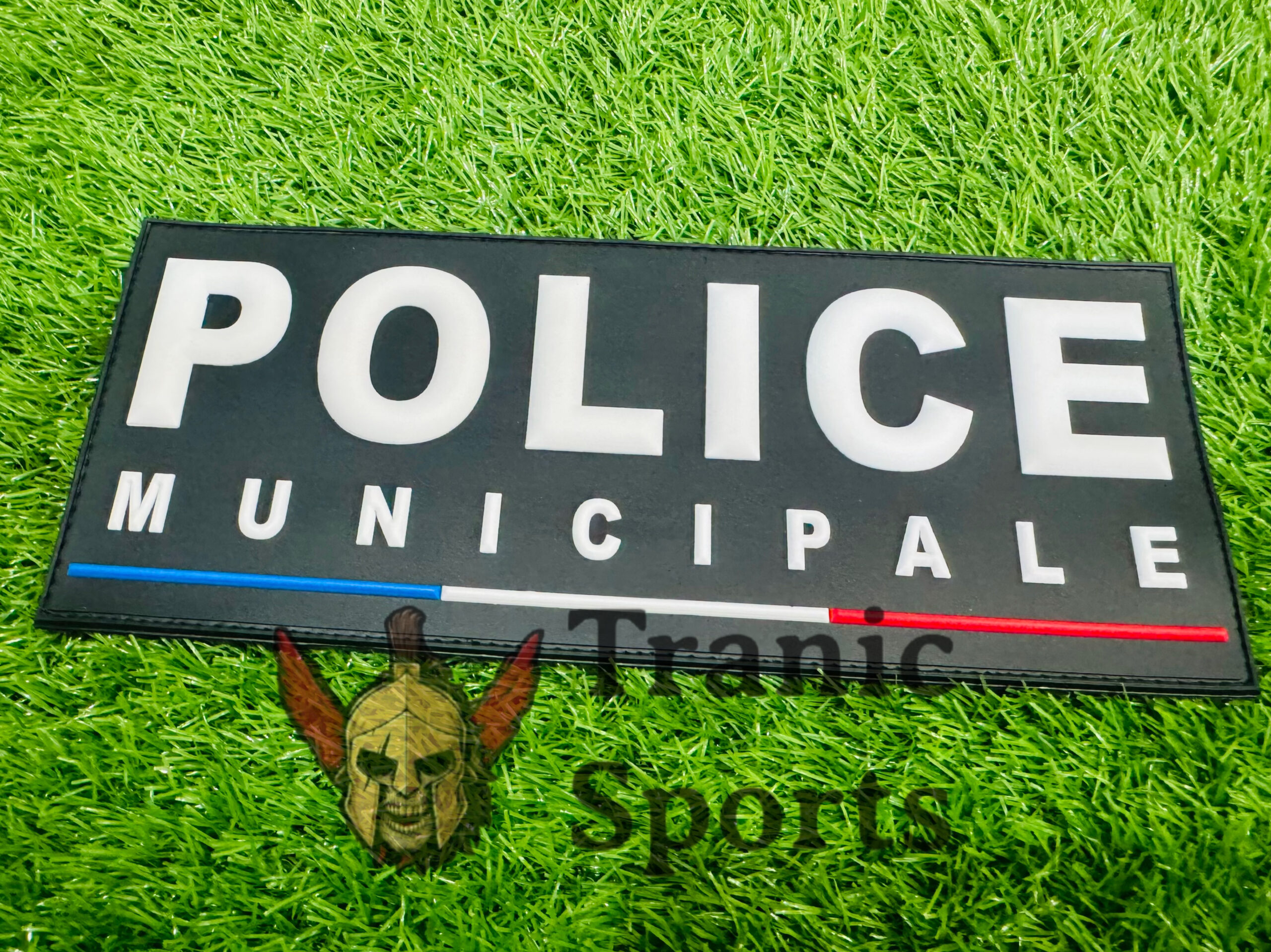 Durable rectangular PVC patch featuring bold white “POLICE MUNICIPALE” text on a black background, accented with blue, white, and red stripes. Ideal for tactical gear, uniforms, or display collections.